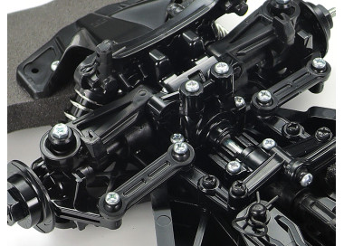 Il telaio TT-02 con trasmissione 4WD ad albero utilizza una disposizione longitudinale con la batteria a sinistra e il motore a destra, per offrire un'eccellente stabilità. Inoltre, presenta bracci delle sospensioni e montanti (uprights) identici a sinistra e a destra per facilitare l'assemblaggio, oltre a scatole ingranaggi di facile manutenzione. È un telaio altamente adattabile, poiché offre 2 diversi passi (wheelbase), 2 impostazioni di altezza da terra e 2 configurazioni di carreggiata (tread set-ups), oltre a una gamma di 10 possibili rapporti di trasmissione. Non è privo di estetica, con mozzi delle ruote a forma di disco freno ed eleganti supporti del paraurti anteriore. I cerchi bianchi a piatto utilizzano pneumatici semi-pneumatici con battistrada.