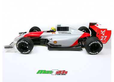 La carrozzeeria viene fornita trasparente, non verniciata , ma completa di decals e casco. L'immagine mostra le prese d'aria del motore (i tromboncini) torniti in alluminio che sono venduti come optional invece che quelli di serie forniti nel kit in lexan.